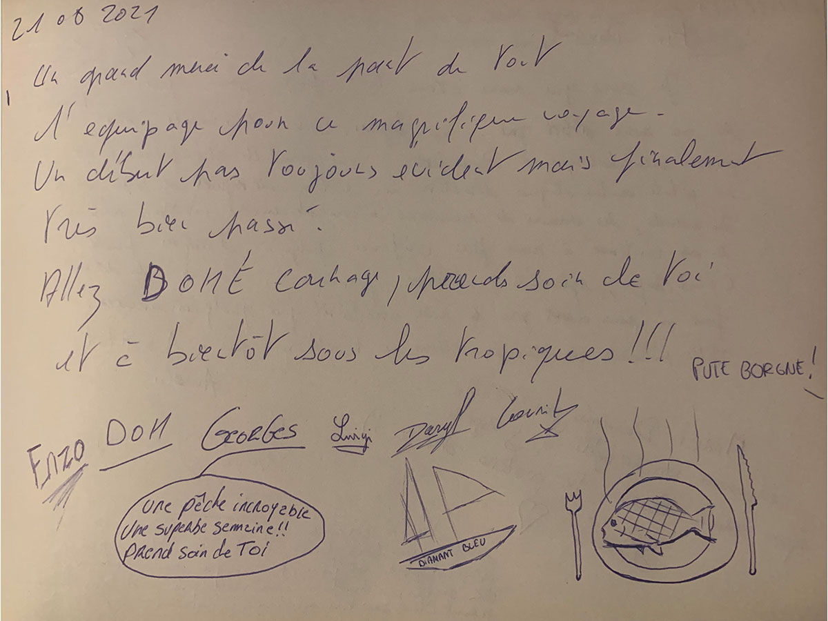 Merci pour ton accueil Doumé. Une semaine que nous ne sommes sûrement pas prêts d’oublier. Tous les temps, toutes les mers, tous les poissons, et tous les rires resteront dans nos mémoires. Un grand merci !
